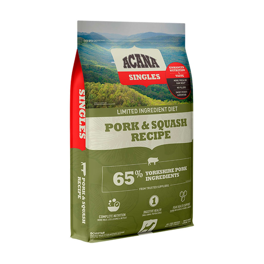 Acana Pork & Squash es un alimento para perros elaborado con un 50% de cerdo Yorkshire para nutrir a tu perro de acuerdo a sus necesidades evolutivas, ACANA Pork & Squash contiene una sola proteína animal de fácil digestión. Cerdo Yorkshire llega fresco en en forma PresaEntera™ - en ricas y nutritivas proporciones de carne, hígado, riñones y cartílago que nutren a tu perro naturalmente.